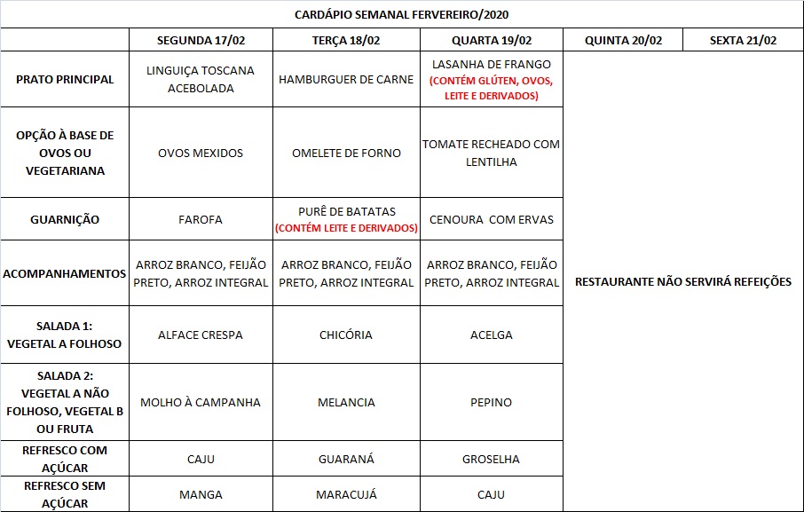 Você está aqui: Página Inicial / Nutrição PRAE(erro) / Cardápios RE (Pupo) 2020 / 17/02 a 19/02/2020
