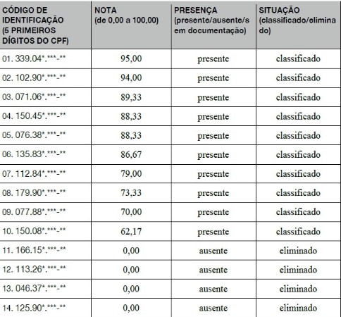 Os candidatos que não compareceram à prova de defesa de memorial ou não entregaram documentação, conforme artigo 4.17 do Edital Nacional, estão automaticamente eliminados.