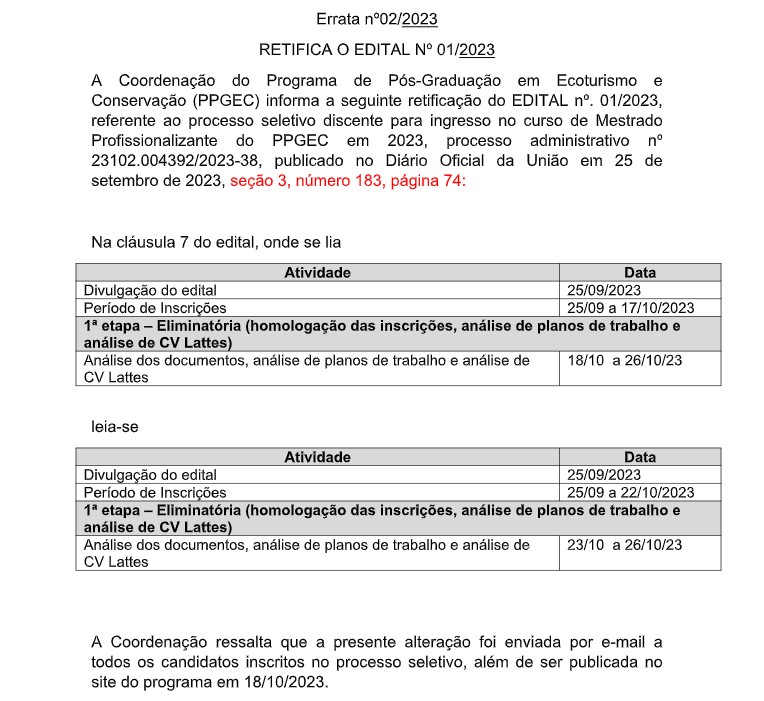 Atenção! O processo seletivo para a turma de 2024 do Programa de Pós Graduação em Ecoturismo e Conservação está aberto. Clicando no link abaixo você terá acesso ao edital e todas as informações importantes.