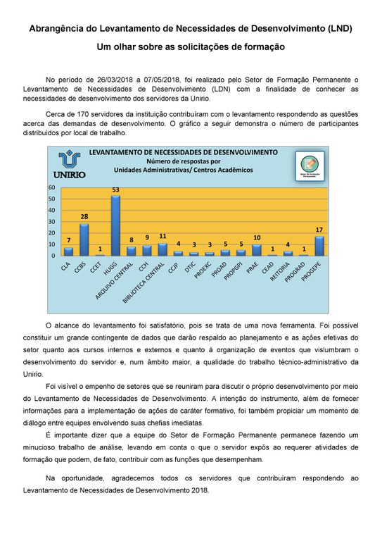 O Plano Anual de Capacitação de 2018 é destinado aos servidores técnico-administrativos ativos e reintegrados em exercício na Universidade Federal do Estado do Rio de Janeiro - UNIRIO, em todas as suas ações, e aos servidores docentes e funcionários terceirizados quando se tratar de cursos internos e ações de desenvolvimento.