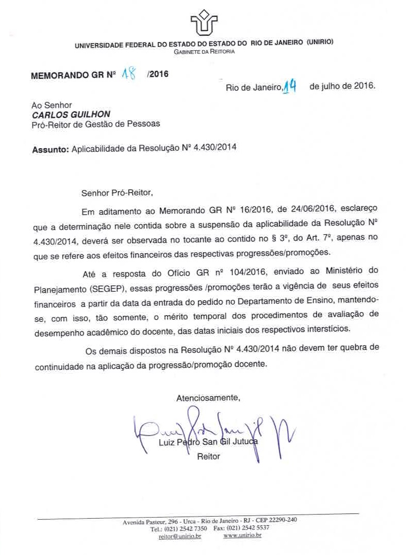PROGEPE divulga Memorando GR nº 18/2016 sobre a Aplicabilidade da Resolução nº 4.430/2014