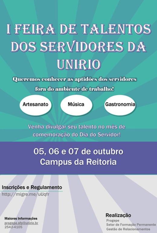O Setor de Formação da Permanente (SFP), da Pró-Reitoria de Gestão de Pessoas (PROGEPE), anuncia a abertura das inscrições para a I Feira de Talentos dos Servidores da UNIRIO, que faz parte do Projeto Banco de Talentos da UNIRIO, que em parceria com a Gestão de Relacionamentos (GERE), tem como objetivo valorizar, conhecer e divulgar os talentos dos servidores, mostrando suas aptidões fora do ambiente de trabalho.