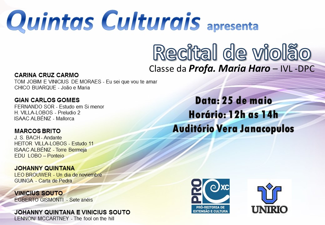 O Projeto Quintas Culturais, desenvolvido pela Pró-reitoria de Extensão e Cultura (PROExC), busca desenvolver o potencial da UNIRIO como agente produtor de atividades artísticas e culturais. Docentes, discentes e técnicos-administrativos podem se apresentar ao público, às quintas-feiras, no Auditório Vera Janacopulos (Av. Pasteur, 296, Urca).