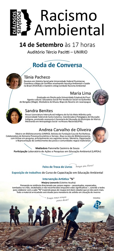 Racismo Ambiental é o tema da Roda de Conversa, promovida pelo Projeto Diálogos Possíveis, que acontece nesta sexta-feira, 14 de setembro, às 17h, no Auditório Tércio Pacitti. As convidadas para o debate serão Tânia Pacheco (coordenadora do Mapa de Conflitos envolvendo Injustiça Ambiental e Saúde no Braisil - FIOCRUZ), Maria Lima (agente cultural, educadora social do Pré-vestibular social no Quilombo de Bongaba/Magé), Sandra Benites (Coordenadora Pedagógica de Educação Indígena; presta assessoria à Prefeitura de Maricá) e Andrea de Oliveira (Graduada em Biblioteconomia pela UNIRIO, atua na área pesquisando sobre os seguintes temas: Memória, Organização e Representação do Conhecimento dos povos e comunidades negras tradicionais).