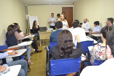 A equipe do Hospital Universitário Gaffrée e Guinle, formada pelo Superintendente do HUGG, Prof. Dr. Fernando Ferry; pelo Diretor Técnico e Chefe da Divisão Médica, Prof. Everton Martins; pelo Gerente de Atenção à Saúde, Prof. Daniel Aragão e pela fisioterapeuta Vivian Pinto explicaram a estrutura e o funcionamento do hospital universitário. O Prof. Dr. Fernando Ferry destacou o  pioneirismo do HUGG em 1983 no tratamento da AIDS e que desde 1993 foi validado como Centro Nacional de Referência da AIDS. Explicou também, como funciona o sistema de regulação da Prefeitura. O Prof. Daniel Aragão, falou sobre a gestão da EBSERH (Empresa Brasileira de Serviços Hospitalares) que deu uma nova estrutura organizacional ao HUGG com a gerência de ensino e pesquisa, administrativa e financeira e a de atenção à saúde. Citou a particularidade do hospital em relação a sua organização histórica em que os serviços são vinculados às disciplinas da Escola de Medicina. Já a fisioterapeuta Vivian Pinto falou sobre o crescimento da fisioterapia no hospital e o Prof. Everton Martins finalizou a apresentação do HUGG, comentando sobre a expectativa em receber o grande número de profissionais. Além do Coordenador da Comissão de Própria de Avaliação (CPA), Prof. Cleyton Vetromilla, participaram os integrantes da comissão formada por Silvia Helena, Oscar Gomes e Wilson Ferreira que explicaram sobre o  trabalho realizado pela CPA como os relatórios de avaliação, autoavaliação da instituição e o Programa de Desenvolvimento Institucional (PDI).