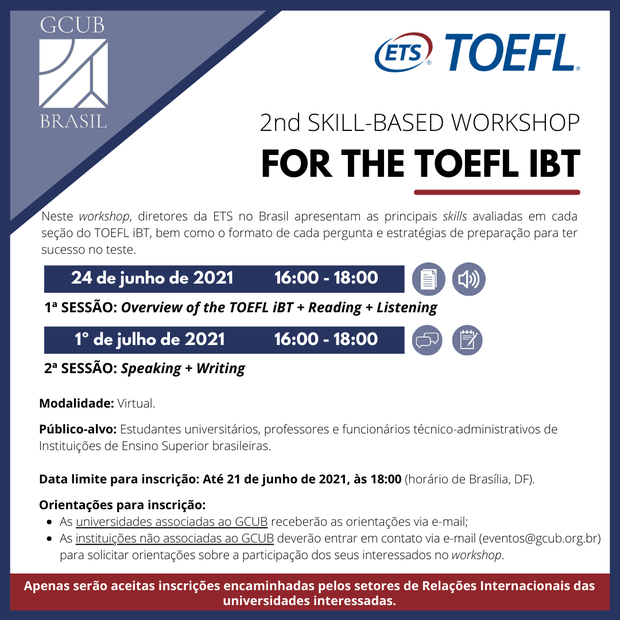 No âmbito do Acordo de Cooperação assinado entre o GCUB e a Educational Testing Service – ETS, organização responsável pelos exames TOEFL iBT e GRE em todo o mundo, serão realizadas mais duas sessões de Skill-Based Workshop for the TOEFL iBT Test.