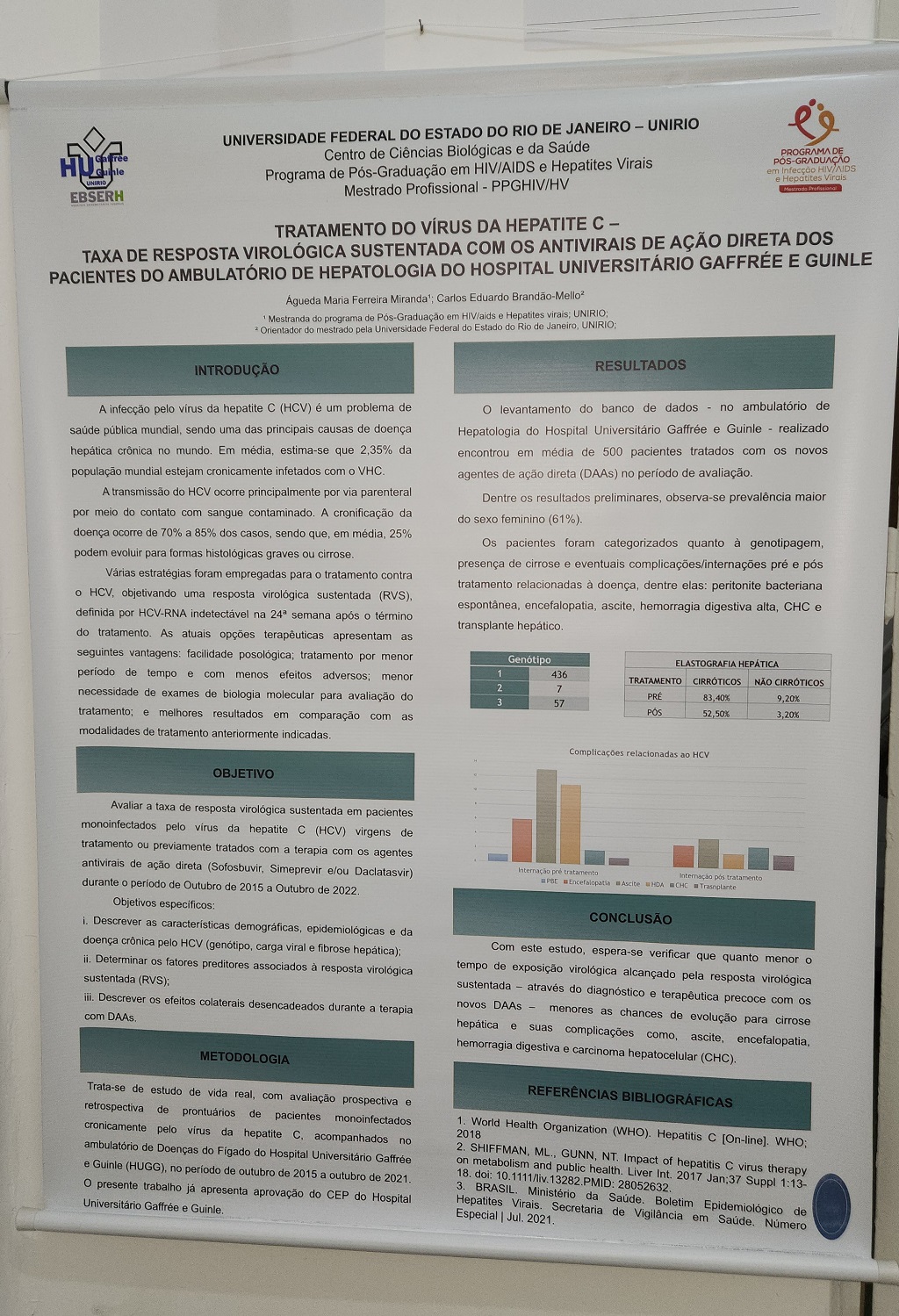 "TRATAMENTO DO VÍRUS DA HEPATITE C - TAXA DE RESPOSTA VIROLÓGICA SUSTENTADA COM O ANTIVIRAIS DE AÇÃO DIRETA DOS PACIENTES DO AMBULATÓRIO DE HEPATOLOGIA DO HOSPITAL UNIVERSITÁRIO GAFFRÉE E GUINLE." (Águeda Miranda)