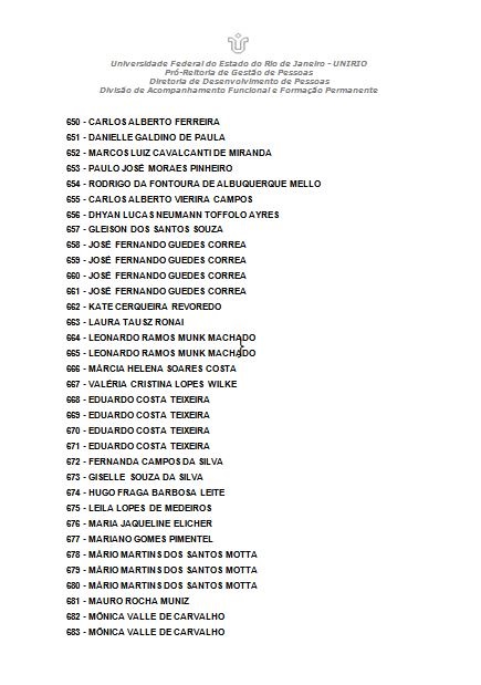 Mais informações podem ser obtidas no Setor de Acompanhamento e Análise do Processo de Trabalho (SAAPT) no telefone: (21) 2542-5523 ou através do e-mail progepe.saapt@unirio.br.