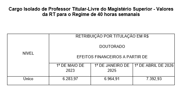 Tabela de Retribuição por Titulação - RT para Cargo Isolado de Professor Titular-Livre para o Regime de 40 horas semanais