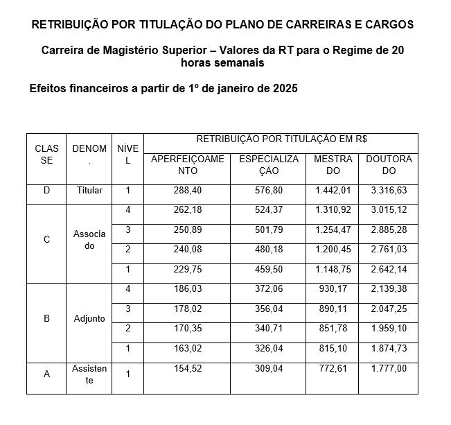 Tabela de Retribuição por Titulação - RT para o Regime de 20 horas semanais