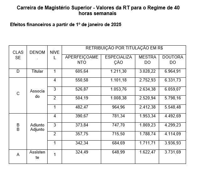 Tabela de Retribuição por Titulação - RT para o Regime de 40 horas semanais