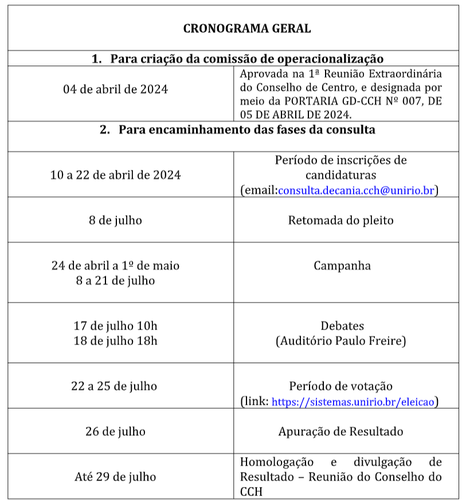 Com a aprovação da readequação do Calendário Acadêmico de 2024, na 46ª Sessão Extraordinária do Conselho de Ensino, Pesquisa e Extensão (Consepe), e o retorno das atividades acadêmicas letivas hoje, dia 4 de julho, esta comissão decidiu por retornar o Pleito da 2ªConsulta Pública para a Decania do CCH na próxima segunda, dia 8 de julho.