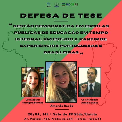 Defesa de Tese - " GESTÃO DEMOCRÁTICA EM ESCOLAS PÚBLICAS DE EDUCAÇÃO EM TEMPO INTEGRAL: UM ESTUDO A PARTIR DE EXPERIÊNCIAS PORTUGUESAS E BRASILEIRAS " - Amanda Moreira Borde da Costa Marques – 14h - 28/04/2022