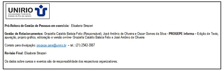 Mais informações podem ser obtidas no Setor de Acompanhamento e Análise do Processo de Trabalho (SAAPT) no telefone: (21) 2542-5523 ou através do e-mail progepe.saapt@unirio.br.