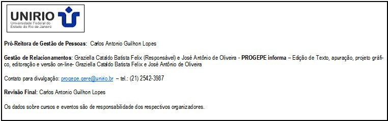 Mais informações podem ser obtidas na Divisão de Administração de Pessoal (DAP) pelo telefone (21) 2542-4030 ou através do e-mail progepe.dap@unirio.br.