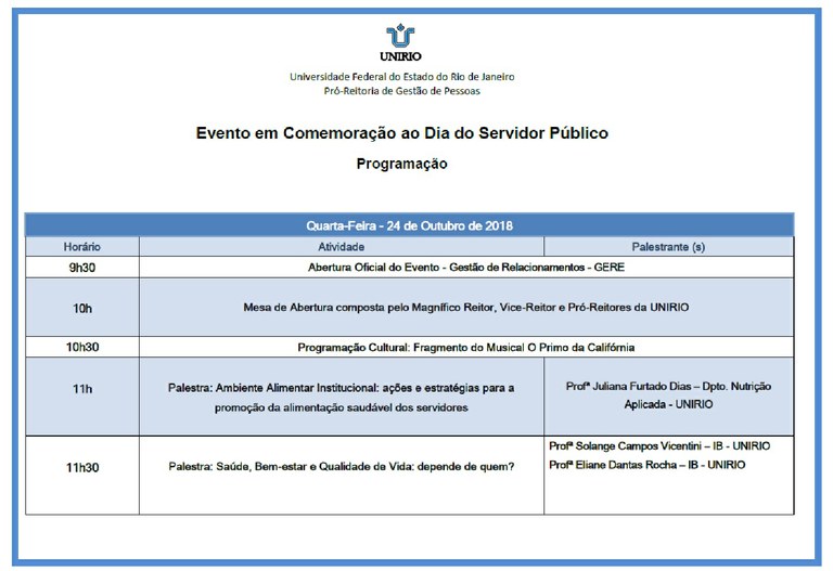 O tema deste ano será Qualidade de Vida do Servidor Público e na parte da manhã terá palestras intituladas “Ambiente Alimentar Institucional: ações e estratégias para a promoção da alimentação saudável dos servidores” com a professora Juliana Furtado Dias, do Departamento de Nutrição Aplicada (UNIRIO) e “Saúde, Bem-estar e Qualidade de Vida: depende de quem?” com as professoras Solange Campos Vicentini (Instituto Biomédico – UNIRIO) e Eliane Dantas Rocha (Instituto Biomédico – UNIRIO).