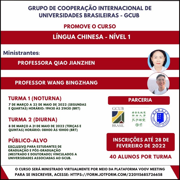 Convidamos os estudantes de graduação e de pós-graduação da UNIRIO a participar do Curso de Língua Chinesa – Nível 1, oferecido pelo Grupo de Cooperação Internacional de Universidades Brasileiras (GCUB), a ser ministrado pelos professores Qiao Jianzhen e Wang Bingzhang, conforme o calendário a seguir.