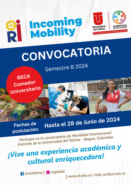 A Universidade de Tolima em Ibagué, Colômbia, informa que está aberta a convocatória para mobilidade acadêmica para o semestre 2024-2. Esta convocatória de mobilidade inclui o benefício de uma bolsa para o refeitório universitário, que permitirá a cobertura do serviço de alimentação*
