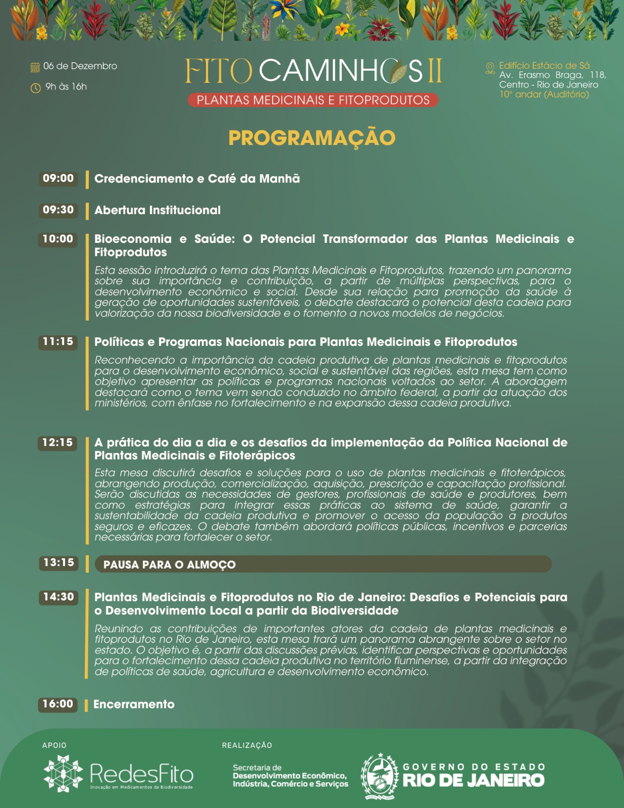 O Governo do Estado do Rio de Janeiro, por meio da Secretaria de Desenvolvimento Econômico, Indústria, Comércio e Serviços - SEDEICS, em parceria com a RedesFito da Fiocruz, realizará, no dia 06 de dezembro, o evento “Fitocaminhos II: Plantas Medicinais e Fitoprodutos”, na cidade do Rio de Janeiro.