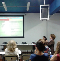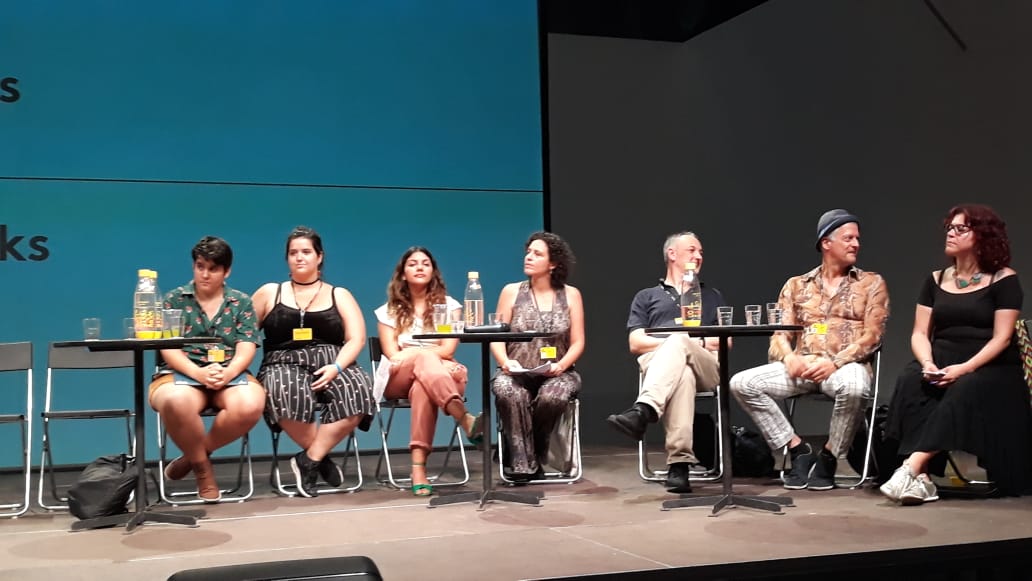 Foto 1 – A Mesa Scenographic Interventions. Niuxa Drago e demais participantes. 2019. ©Chico Pelúcio Foto 2 – Imagens da projeção da palestra. 2019 ©Chico Pelúcio. |