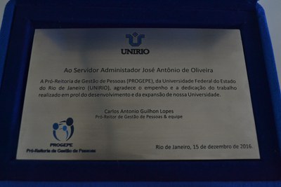 O Administrador e servidor reintegrado, José Antônio de Oliveira, lotado na Gestão de Relacionamentos da Progepe, recebeu no dia 15 de dezembro do Pró-Reitor de Gestão de Pessoas, Carlos Antonio Guilhon Lopes, placa em homenagem aos serviços prestados em prol do desenvolvimento e expansão da Unirio.