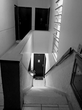 A fotografia foi tirada nos momentos iniciais da pandemia. No momento em que descer para buscar alimentos era uma tarefa assustadora e ao mesmo tempo remetia as saudades de circular sem preocupação. A escada que conecta com o mundo exterior, traz saudade e leva para um novo tempo. Essa foto foi tirada na escada do prédio onde moro.