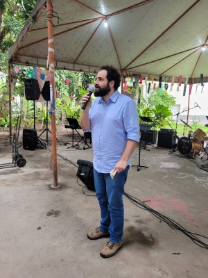Vitor Halfen, da Coordenadoria de Engenharia da UNIRIO, apresentando projeto realizado na universidade