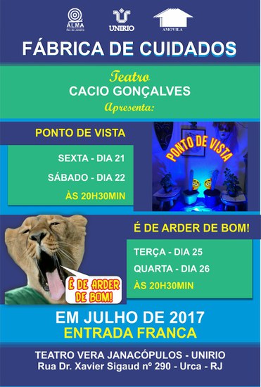 O curso de teatro do Programa Fábrica de Cuidados apresenta duas peças este mês, no Auditório Vera Janacopulos. A primeira delas, Ponto de Vista, acontece nesta sexta-feira, dia 21, e no sábado, 22, às 20h30. Já a comédia É de arder de bom! será encenada na próxima terça-feira, dia 25, e na quarta-feira, dia 26, também às 20h30. A entrada é franca.