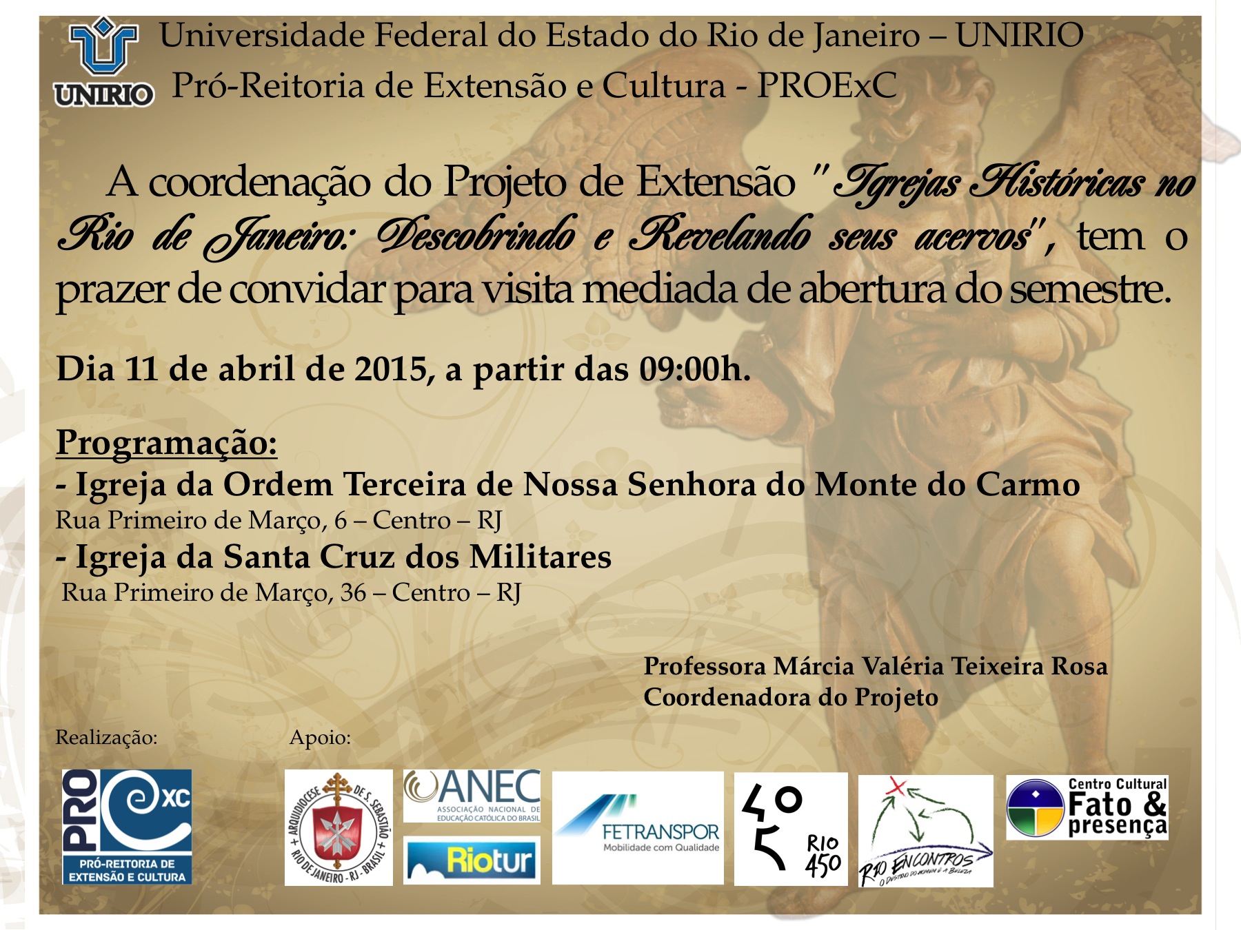 O projeto de extensão Igrejas Históricas do Rio de Janeiro: descobrindo e revelando seus acervos promove neste sábado, dia 11 de abril, a partir das 9h, a visita guiada de abertura do primeiro semestre de 2015. A coordenadora do projeto, professora Márcia Valéria Teixeira Rosa, conduzirá os participantes pelo interior de duas igrejas na região central da cidade.