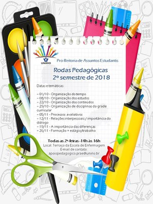 O Setor de Apoio Pedagógico (SEPED) convida os estudantes para as Rodas Pedagógicas do 2º semestre de 2018 que iniciarão na próxima segunda-feira, dia 01/10/2018, às 14h, no Terraço da Escola de Enfermagem (Avenida Pasteur n. 296). O cronograma das atividades segue abaixo ou para acessar [clique aqui].
