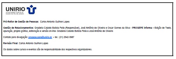 Mais informações podem ser obtidas na Divisão de Administração de Pessoal (DAP) através do telefone: (21) 2542-4030 ou e-mail progepe.dap@unirio.br.