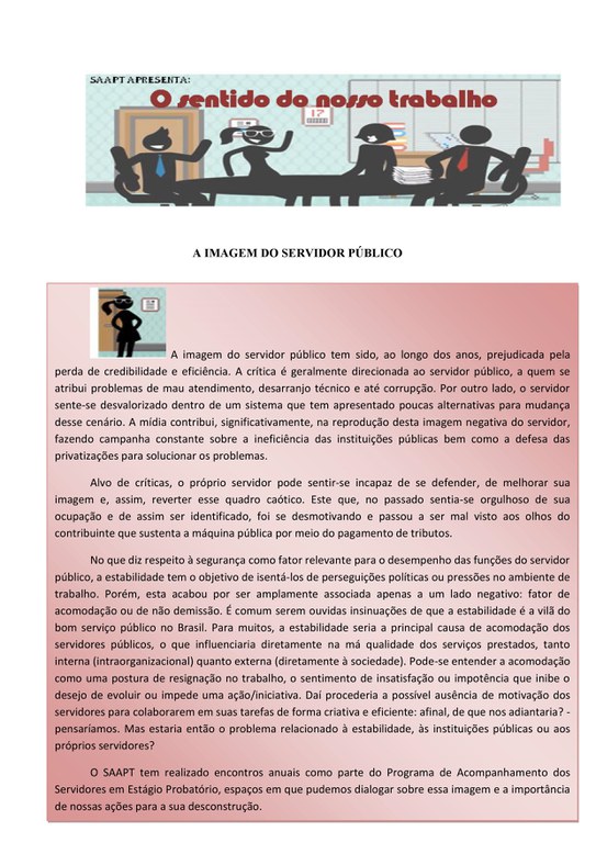O Setor de Acompanhamento e Análise do Processo de Trabalho (SAAPT), da Pró-Reitoria de Gestão de Pessoas (PROGEPE), informa que já está disponível para preenchimento o formulário da Avaliação de Desempenho dos Servidores Técnico-Administrativos de 2018 até o dia 14 de novembro.