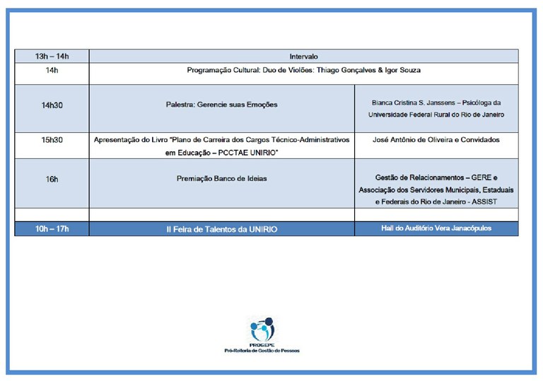 No horário da tarde, a abertura será com o Duo de Violões de Thiago Gonçalves & Igor Souza e após a apresentação musical, a psicóloga da Universidade Federal Rural do Rio de Janeiro, Bianca Cristina S. Janssens,  ministrará palestra sobre o tema “Gerencie suas Emoções”. Em seguida, terá a apresentação do Livro “Plano de Carreira dos Cargos Técnico-Administrativos em Educação – PCCTAE UNIRIO”, com o administrador e servidor reintegrado da UNIRIO, José Antônio de Oliveira.