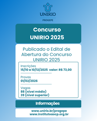 Com as inscrições abertas e provas previstas para 1 de fevereiro de 2026, o Concurso da UNIRIO oferece 127 vagas, das quais 88 de nível médio e 39 de nível superior. A Universidade Federal do Estado do Rio de Janeiro (UNIRIO) divulgou o edital do concurso para cargos técnico-administrativos em educação.