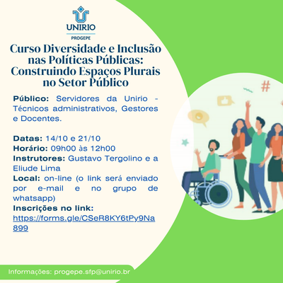 A Pró-reitoria de Gestão de Pessoas - PROGEPE - por meio do Setor de Formação Permanente - SFP comunica a abertura das inscrições para o Curso Diversidade e Inclusão nas Políticas Públicas: Construindo Espaços Plurais no Setor Público.