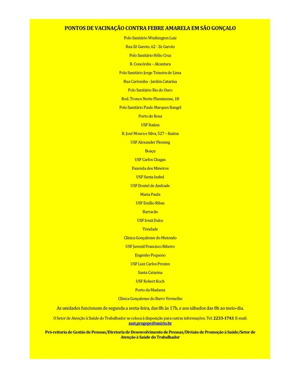 Mais informações podem ser obtidas na Divisão de Acompanhamento Funcional e Formação Permanente (DAFFP) pelo telefone (21) 2542-5516 ou através do e-mail progepe.daffp@unirio.br.