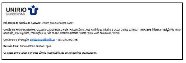 Mais informações podem ser obtidas no Setor de Formação Permanente (SFP) através do e-mail progepe.sfp@unirio.br.