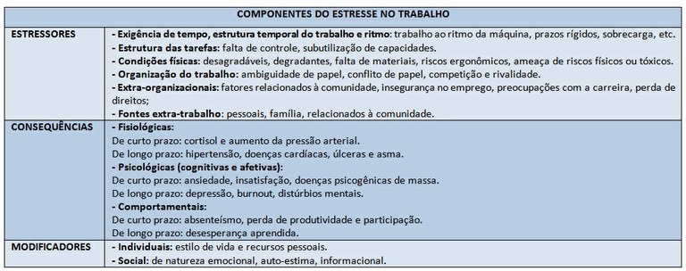 O estresse associa-se de formas variadas a todos os tipos de trabalho, prejudicando não só a saúde, mas também o desempenho dos trabalhadores. Ele ocorre quando há um desencontro entre as condições de trabalho e os trabalhadores individuais, quando as exigências do trabalho não estão em equilíbrio com as capacidades, recursos ou necessidades do trabalhador.