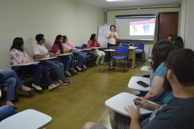 Enfermeira Aline Lima ministrando palestra sobre o tema da Campanha Outubro Rosa