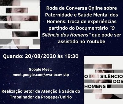 Em Homenagem ao Dia dos Pais, o Setor de Atenção à Saúde do Trabalhador - SAST, da Universidade Federal do Estado do Rio de Janeiro - Unirio, fará uma Roda de Conversa Online sobre Paternidade e a Saúde Mental dos Homens, tendo como ponto de partida nossas experiências de vida e o Documentário "O Silêncio dos Homens", que você pode assistir no link: