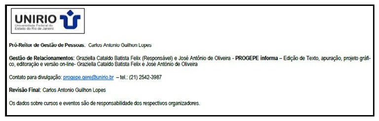 Mais informações podem ser obtidas na Divisão de Acompanhamento Funcional e Formação Permanente (DAFFP) pelo telefone (21) 2542-5516 ou através do e-mail progepe.daffp@unirio.br.