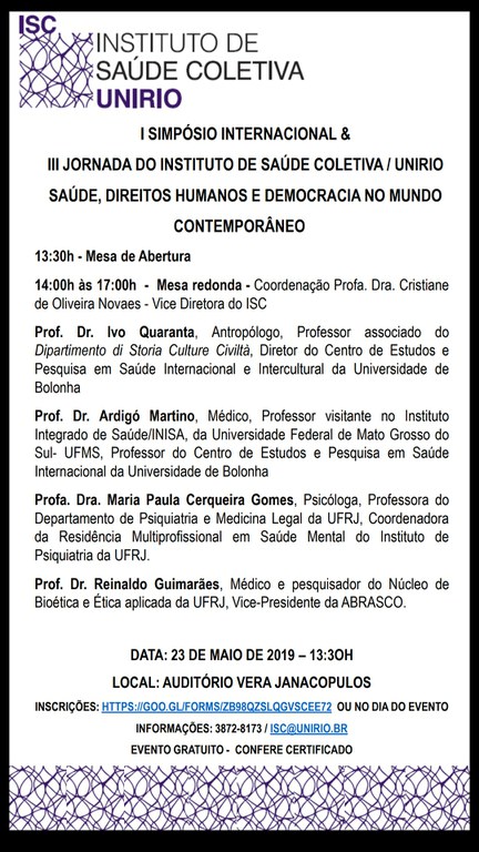 é com imensa alegria que informamos a realização do I SIMPÓSIO INTERNACIONAL & III JORNADA DO INSTITUTO DE SAÚDE COLETIVA/UNIRIO, a ser realizado no dia 23/05/2019, com início às 13:30h, no Auditório Vera Janacopulos, com o Tema: “SAÚDE, DIREITOS HUMANOS E DEMOCRACIA NO MUNDO CONTEMPORÂNEO”.