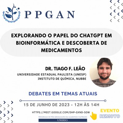 Palestra "Explorando o Papel do ChatGPT em Bioinformática e Descoberta de Medicamentos" será ministrada pelo Dr. Tiago F. Leão, pesquisador de pós-doutorado na Universidade Estadual Paulista (Unesp), Araraquara no Instituto de Química, NuBBE.