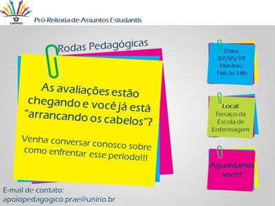 Convidamos para a Roda Pedagógica que acontecerá no dia 07/05/19, às 16h, no Terraço da Escola de Enfermagem.