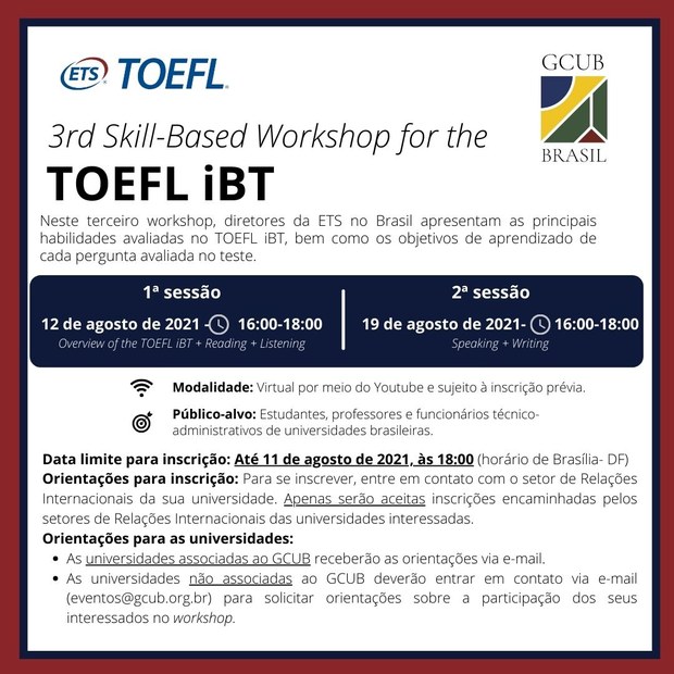 No âmbito do Acordo de Cooperação assinado entre o GCUB e a Educational Testing Service – ETS, organização responsável pelos exames TOEFL iBT e GRE em todo o mundo, serão realizadas mais duas sessões de Skill-Based Workshop for the TOEFL iBT Test.