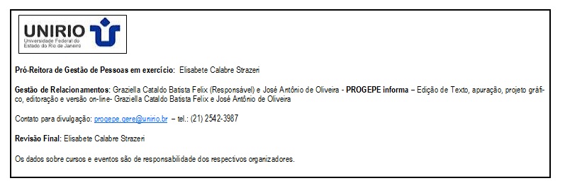Mais informações podem ser obtidas no Setor de Acompanhamento e Análise do Processo de Trabalho (SAAPT) pelo telefone (21) 2542-5523 ou pelo e-mail progepe.saapt@unirio.br.