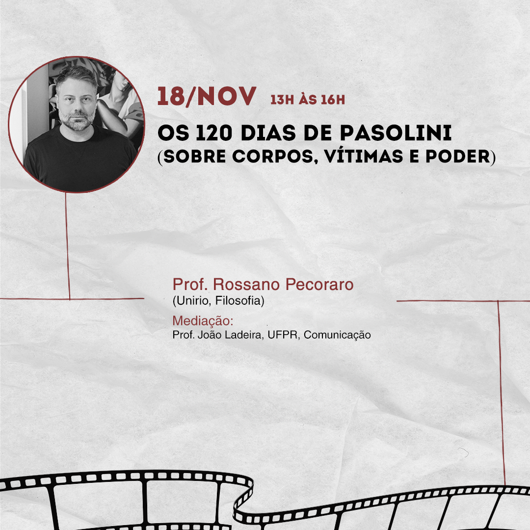 · O prof. Rossano Pecoraro (Universidade Federal do Estado do Rio de Janeiro/UNIRIO) abordará o tema “Os 120 dias de Pasolini (sobre corpos, vítimas e Poder”.