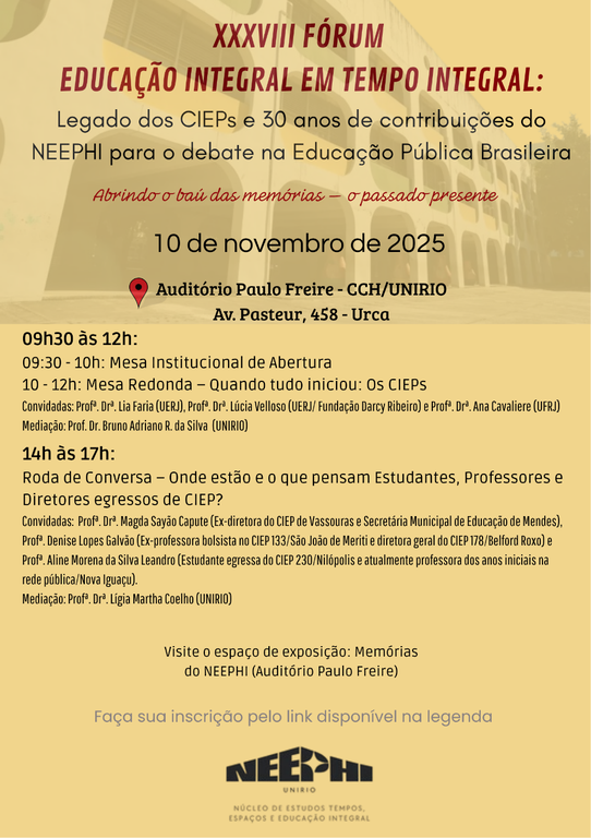 Nesta edição dos Fóruns, comemoramos o legado dos CIEPs e os 30 anos de contribuições do NEEPHI para o debate na Educação Pública Brasileira – subtítulo deste nosso XXXVIII encontro!