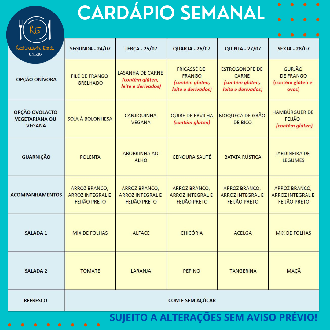Você está aqui: Página Inicial / Nutrição PRAE(erro) / Cardápios PUPO 2023 / 24 a 28/07
