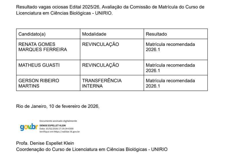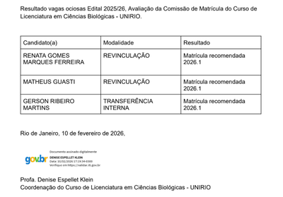 Matrícula para vagas ociosas - Licenciatura em Ciências Biológicas
